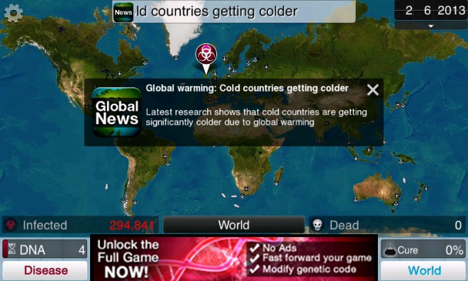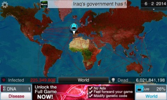 No topo da tela temos uma contagem de dias que pode tanto ser pausada como avançada, porém esta última opção só é disponível para quem comprou a versão completa do jogo. Assim que seu nível de infecciosidade estiver bom, sua doença pode se espalhar para outro país através das fronteiras ou pelas linhas aéreas e marítimas dependendo de como sua doença foi evoluída.