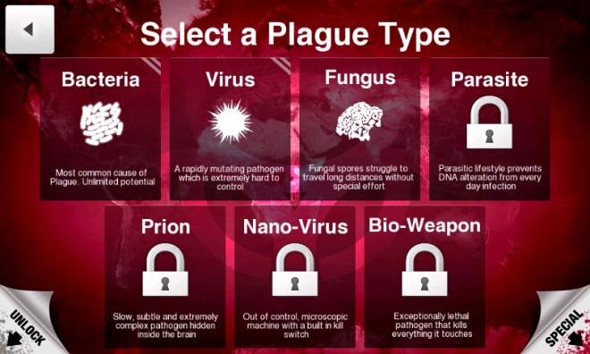 Você começa o jogo escolhendo o nome para sua doença e selecionando qual tipo de agente infeccioso sua doença será. As opções de agentes são bactéria, vírus, fungo, parasita, príon, nano-vírus e arma biológica, cada uma com seu estilo de gameplay próprio que se torna mais difícil a cada agente novo liberado.