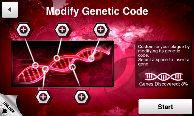O jogo te dá uma opção chamada de “Modificar Código Genético”, onde permite você por perks ou vantagens que te ajudam durante a gameplay, como mais DNA para comprar seus upgrades ou se tornar mais difícil para se produzir uma cura.