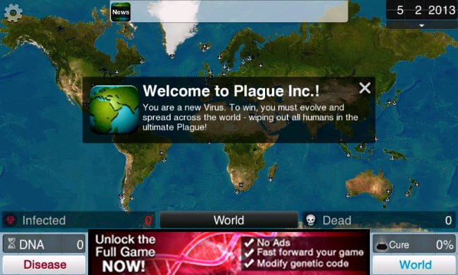 Você simplesmente precisa escolher em qual país quer iniciar sua infestação e começar a evoluir sua doença. O jogo possui um mapa mundi bem bonito e detalhado, com a maioria dos países do mundo, todos eles interconectados através de fronteiras, rotas aéreas e marítimas.