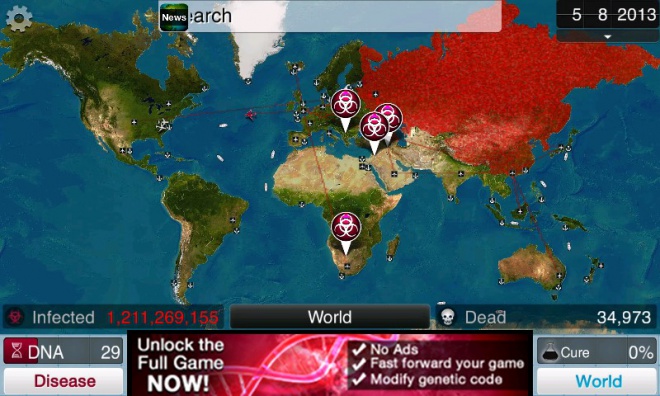 Com o decorrer do jogo você adquire aos poucos DNA para poder gastar e melhorar sua doença Você também pode adquirir um bônus de DNA tocando em bolas amarelas que surgem dos países infectados.